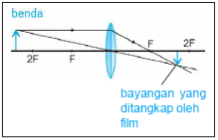 Jika diperhatikan, prinsip kerja antara kamera dan mata kita adalah sama. Mata kita menangkap bayangannya di retina yang akan diolah oleh otak melalui saraf, sedangkan pada kamera, bayangan yang ditangkap lensa dibentuk pada film. Telah kamu ketahui bahwa bayangan yang dibentuk oleh lensa cembung bersifat nyata dan terbalik. Bayangan yang dibentuk pada film kamera bersifat nyata, terbalik, dan diperkecil seperti ditunjukkan pada di bawah ini.
